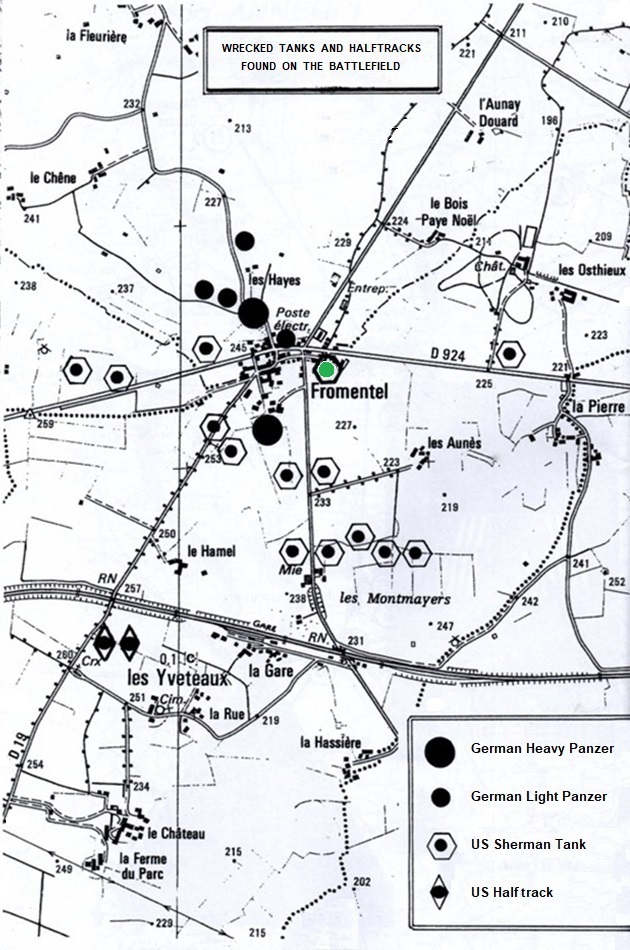 This map shows the locations of wreaked tanks and half-tracks around Fromentel. There were two Panthers, two Pz.Kpfw. IVs and two light panzers (probably StuG IIIs or some other SPs). Since TF X attacked Fromentel from the east and Pool’s tank was most likely leading, the US Sherman tank symbol with the green (Pool’s middle name) circle is the approximate location where Pool’s tank was knocked out.