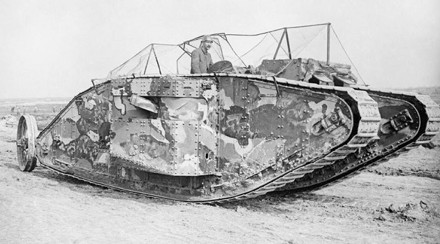 This is the first official photograph taken of a tank going into action on 15 September 1916. The crewman shown is wearing a leather tank helmet. Note the improvised anti-grenade screen and the camouflage scheme.
