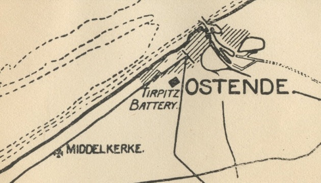 Ostende (today Ostend) is located northeast of Dunkirk. The “Tirpitz” coastal defence battery had four 11-inch (280mm) guns manned by German Marines.