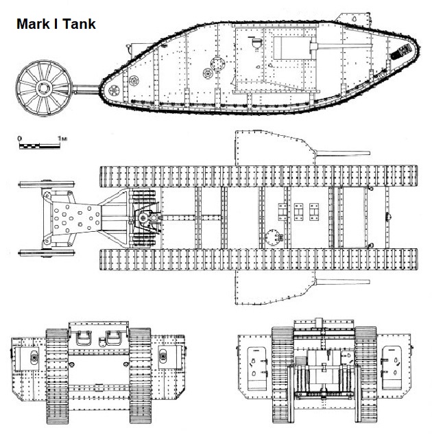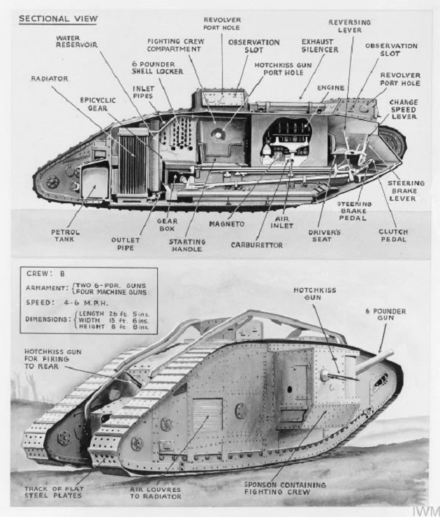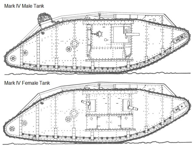 The Mark I tanks were built as two types which were essentially the same except for their armament. The “Male” type mounted two Hotchkiss 6-pounder (57mm) naval guns and two machine guns in the sponsons. The “Female” type mounted four machine guns in the sponsons. In combat, male and female tanks would be paired together. The female tank was used to provide defensive fire against enemy infantry attacks while the male tank attacked enemy gun emplacements and crush barbed wire entanglements. A total of 150 Mark I tanks were built, half Male and half Female.
