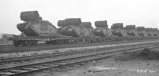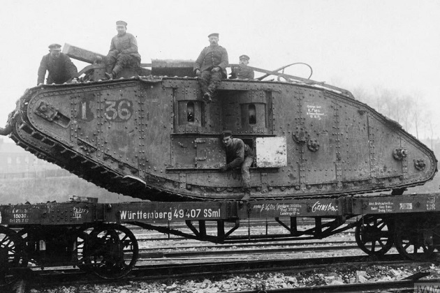 A captured Mark IV Female tank I36 being transported on a German railway flat car. The tank was recovered by the German 2nd Anti-Aircraft Company (Kompanie-Flak 2) between Anneux and Graincourt-les-Havrincourt on 12 December 1917.