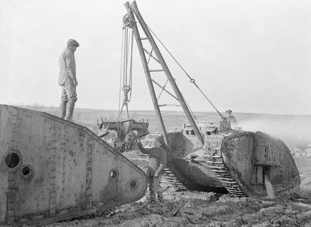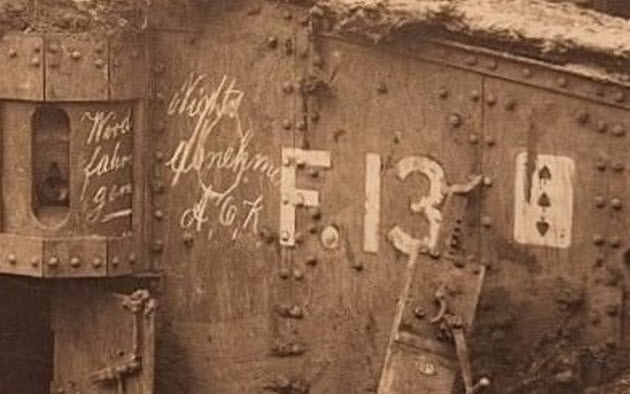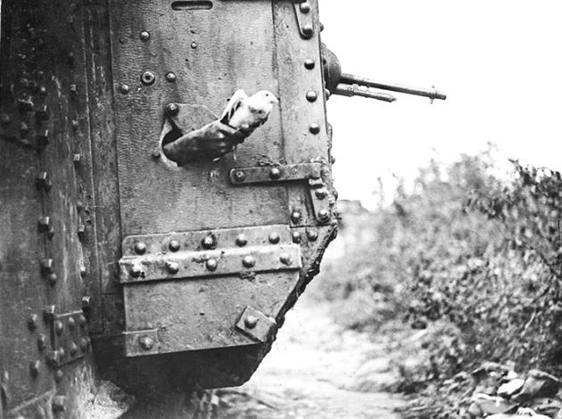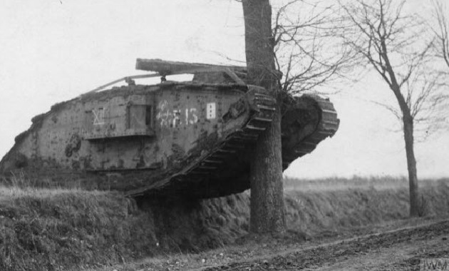 In January 1918, Mark IV Female Tank F.13 starred in the German propaganda film “Die Englischen Tanks bei Cambrai”. Here it is pushing about to push a tree over.