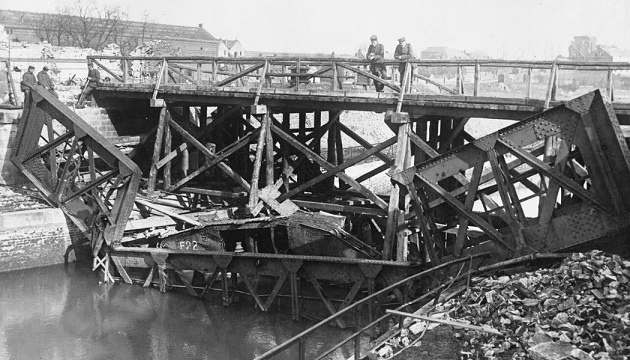 In Masnières, the Germans built a wooden bridge across the canal over Mark IV Male tank F22 to allow troops and supplies to reach the front. Note code “F22” on the front of the tank.