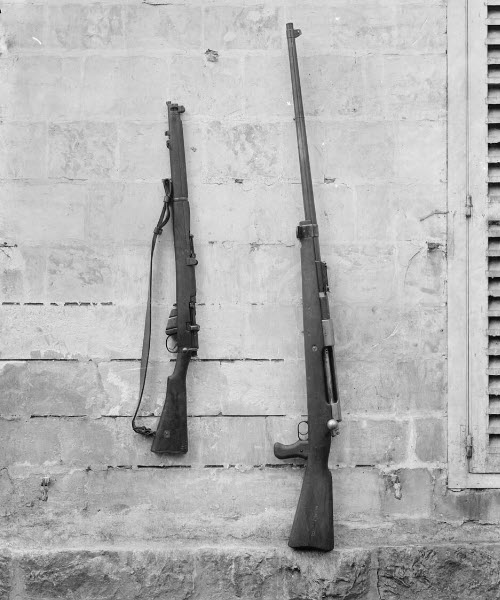 A captured German Mauser 1918 T-Gewehr anti-tank rifle compared with a British Lee Enfield .303 rifle at Neulette (northwest of Arras) on 30 August 1918.