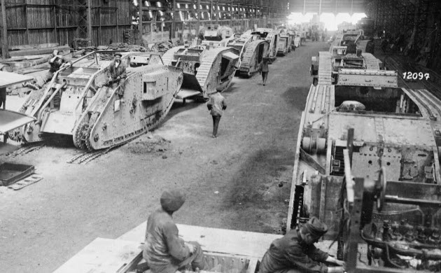 This photo is captioned as the Production line of British Mark VI tanks. The Mark VI tank was canceled in December 1917. These are Mark V* tanks.