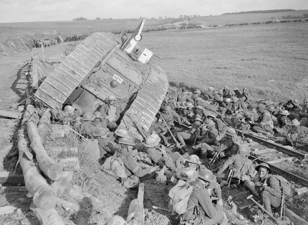 Men of the 20th Battalion, Manchester Regiment (25th Division) resting by a Mark V* Female tank (serial number 9891) disabled by side-slipping down a railway embankment near Prémont (east of Amiens) on 8 October 1918. The post on top of the tank has signaling paddles. Note the white-red-white aerial recognition stripes painted on top of the tank.