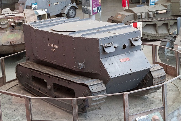 Today Little Willie is displayed at The Tank Museum at Bovington. It is essentially an empty hull, without an engine, but still with some internal fittings. The rear steering wheels are not fitted and there is damage to the hull plating around the right hand vision slit, possibly caused by an attempt at some point to tow the vehicle by passing a cable through the slit. This would have torn the tank’s comparatively thin steel plating.