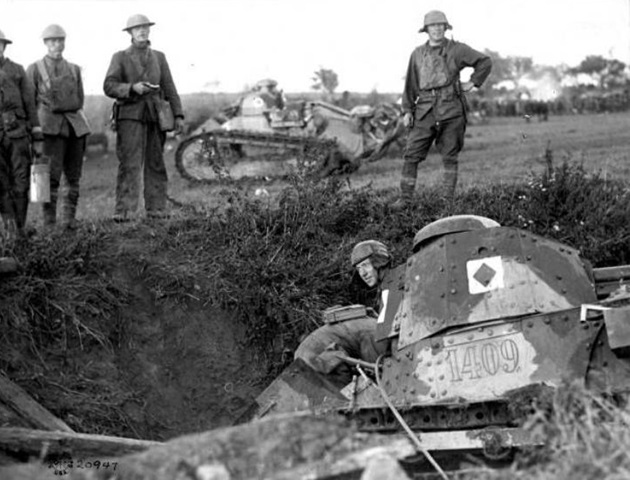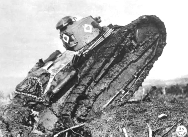 A US crewed Renault FT tank climbs out of a trench near Seicheprey.