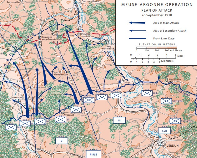 On October 4th, the second phase of the Meuse-Argonne offensive began. The first US assault divisions (the 35th, 37th, 79th, and 91st) were replaced by the 1st, 3rd and 32nd Divisions. The 1st Division created a gap in the lines when it advanced 2.5 km (1.6 miles).