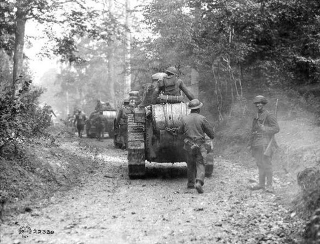 Tanks of the 301st Tank Battalion going into action near St. Souplet on the morning of 17 October 1918. Note Old Glory flying on the closest tank.