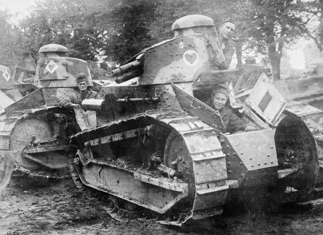 US tank men in their Renault FT tanks. Note their markings based on playing cards colors, hearts and diamonds.