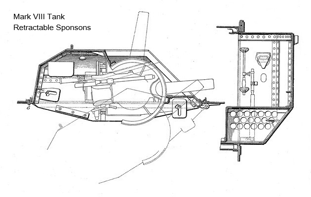 The Mark VIII was not built in a female or male configuration like the earlier tanks. There were no machine guns in the side sponsons, only the 6-pounders each manned by a gunner and loader. The side machine guns were to the rear of the sponsons mounted in the hull doors. Five more machine guns were in the hull superstructure: two at the front (left and right) next to the driver and one on each of the other sides.