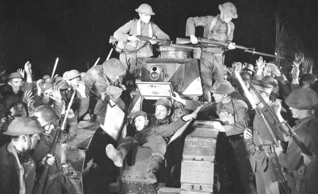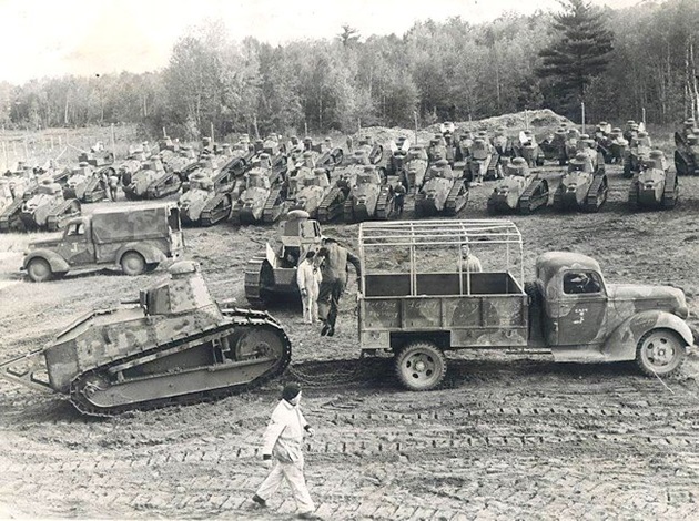This photograph was taken on 10 October 1940. The tanks were towed from the train to this site by Army trucks. Mechanics tune the engines and serviced 180 tanks that arrived that day. At the rear of the truck in the foreground, a soldier has jumped off the cargo bed and the photo has captured him in mid air. Between the truck and tank on the ground are the towing chains.