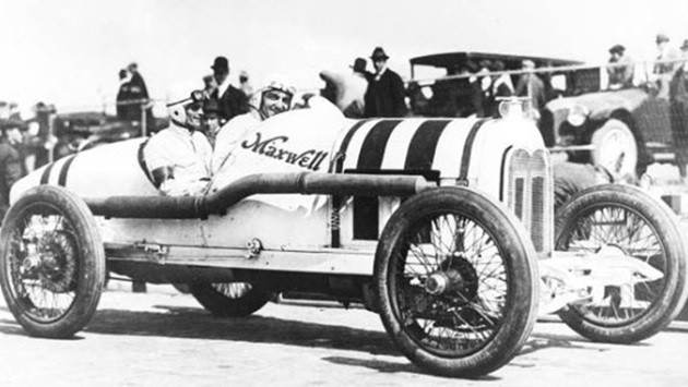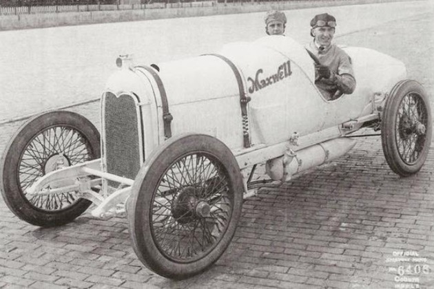 One of four Maxwell Special race cars of the 1916 Prest-O-Lite Team. Drivers: Rickenbacker (at the wheel) and Pete Henderson.