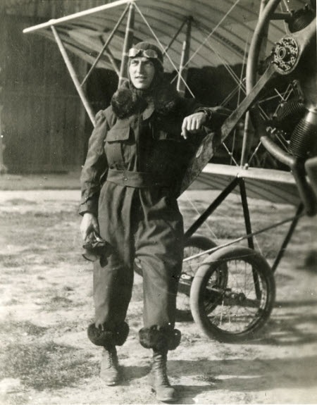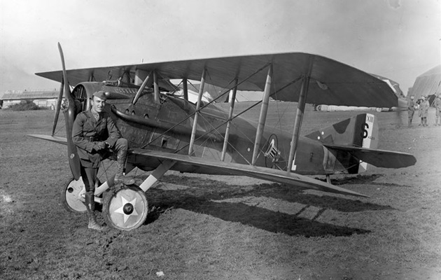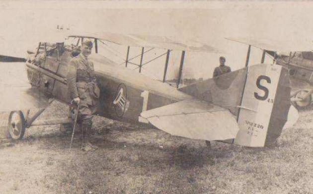 Rickenbacker standing next to his assigned SPAD XIII in September 1918 after returning from the hospital. Note he is holding a cane. His inner ear infection affected his sense of balance and he still needed the cane for a short time.