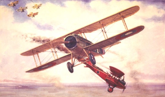 Artwork of Rickenbacker’s SPAD XIII shooting down a red German biplane, most likely an observation plane due to the rear machine gun.