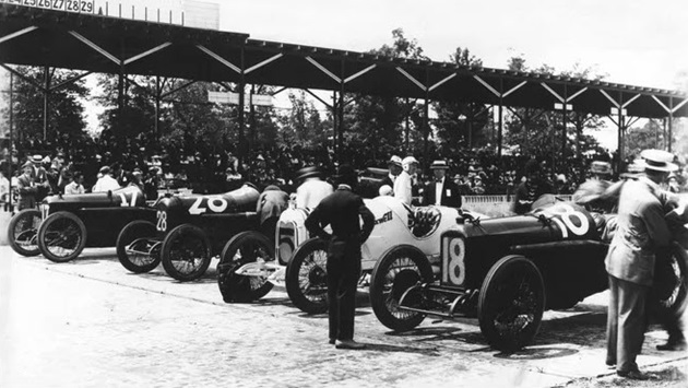 This is the first row of the starting lineup of the 1916 Indianapolis 500. From far left, No. 17 was driven by Dario Resta (who won the race), No. 28 was Gil Andersen; No. 5 Eddie Rickenbacker, and No. 18 Johnny Aitken. Rickenbacker was ranked 2.
