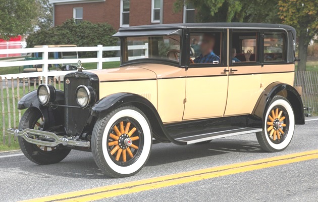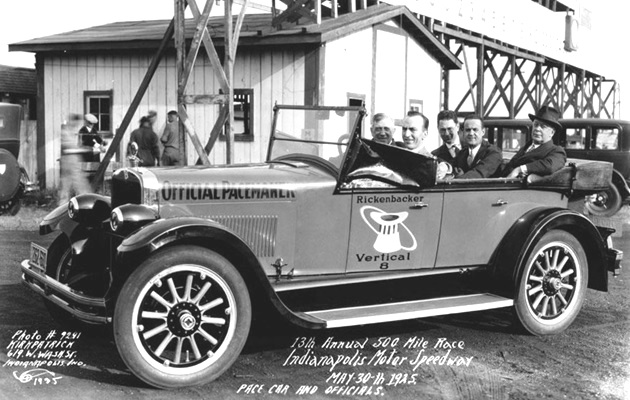 Rickenbacker and race officials in the pace car of the 13th Indianapolis 500 race on 30 May 1925 (before he purchased the speedway). The pace car is a new 1925 Rickenbacker Vertical Eight Superfine convertible. The text “OFFICIAL PACEMAKER” is painted on the side of the hood (Bonnet). Eddie is holding a chart or board against the steering wheel probably with the race cars information.