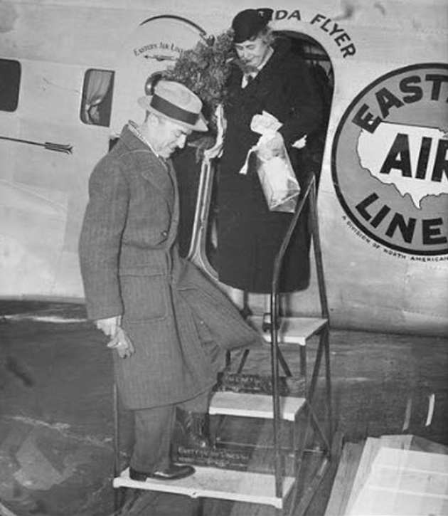 Rickenbacker greeting Mrs. Edith Wilson (ex-First Lady, 1915-21) completing her first extended plane (DC-2) trip on 17 January 1935.