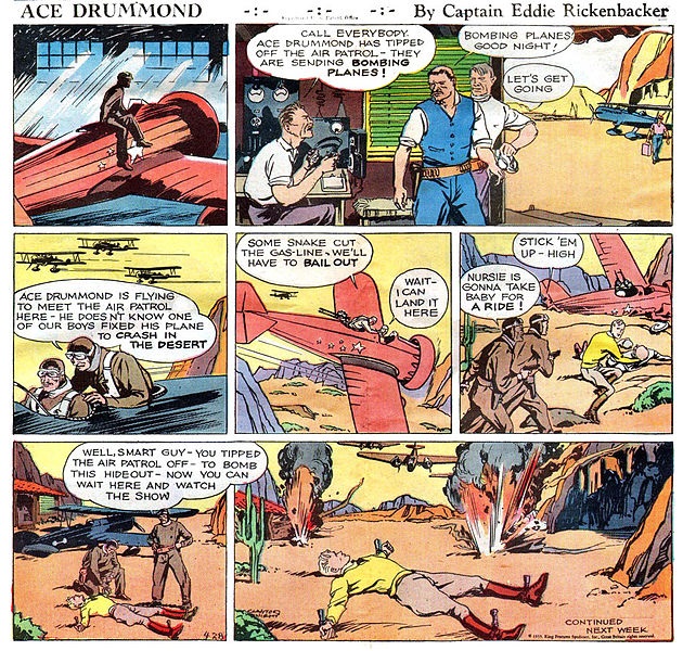 Rickenbacker scripted a popular Sunday comic strip, “Ace Drummond”, from 1935 to 1940 for King Features Syndicate. He worked with aviation artist and author Clayton Knight, who illustrated the series. The strip followed the adventures of barnstormer Drummond as he traveled around the world and defeated evil doers.