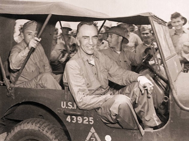 On Samoa, Rickenbacker is smiling in a Jeep as he is driven away from the landing strip to get a meal of hot soup and ice cream. Note his left hand and wrist is bandaged and is holding a cigarette. The officer in the back seat is unidentified. Sources state that the Jeep driver in this photo is Colonel Griffin but in the above photo Griffin is older with a mustache and this younger marine does not have a mustache.