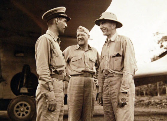 In December 1942, Rickenbacker (right) talking with Lieutenant Eadie (left) under the wing of a PBY Catalina. The officer between them is unidentified. Sadly, Eadie and his Kingfisher (not The Bug) was listed as MIA on 8 January 1945.