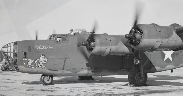 On 3 July 1943, B-24E “Capt. Eddie Rickenbacker” was burning fuel at an excessive rate prior to losing two engines over the Pacific Ocean off the coast of Santa Barbara. Pilot Thorel “Skip” Johnson ordered the crew into their parachutes and turned the bomber around, heading back towards Santa Barbara. Two airmen, Robert Prosser and Peter Dannhardt, not knowing they were still over water, bailed out prior to the pilot giving the order and were lost at sea. The remaining eight crewmen bailed out safely after the bomber had reached land over the mountains. The unmanned bomber crashed 9 miles (14.5 km) north of Santa Barbara. The crew’s next bomber, a Consolidated B-24D-105-CO Liberator, s/n 42-40837, was named “BOB ‘N PETE” for the two crewmen that were lost at sea.