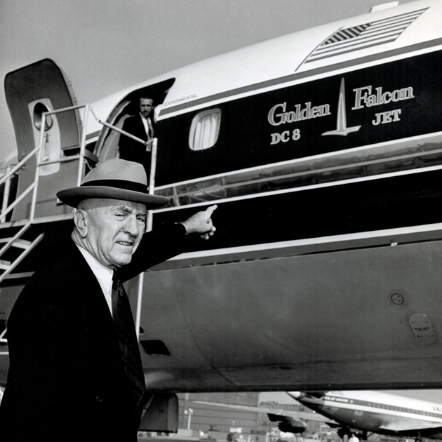 Rickenbacker points out the Golden Falcon title on one of Eastern’s DC-8-21 jets in October 1960.