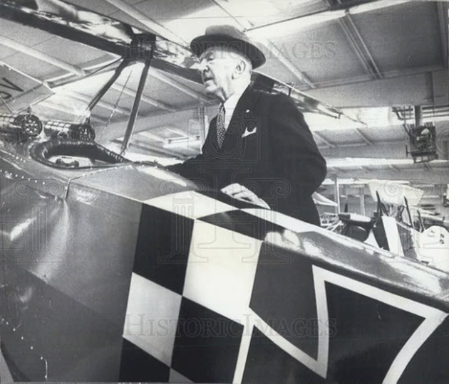 A 1971 press photo of 81 year old Rickenbacker looking at a WWI German Fokker biplane replica at a museum in Milkwaukee, Wisconsin.
