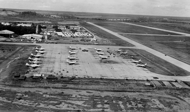 B-57Bs stand ready on the east ramp of Bien Hoa Air base in August 1964. In the background near the runway on the left is the control tower.
