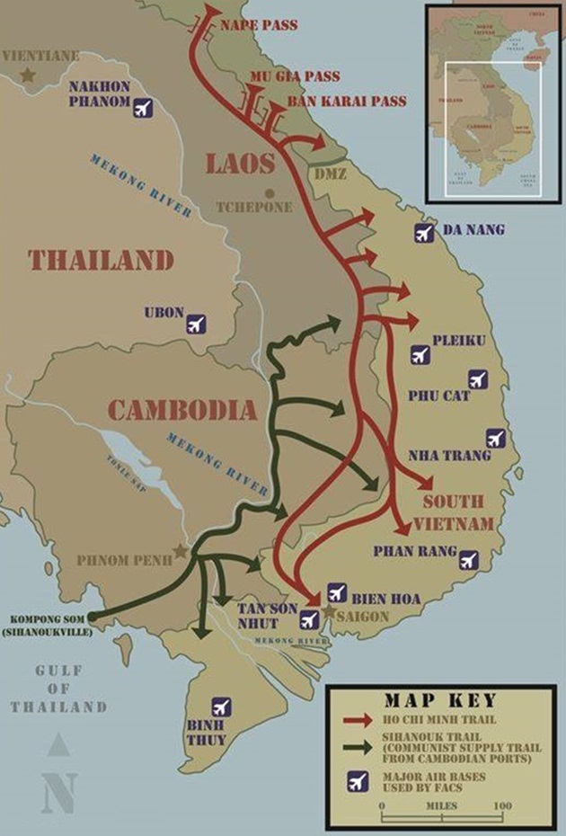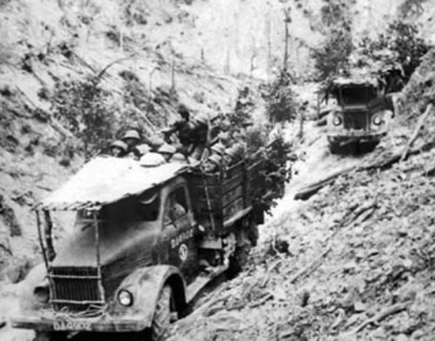 Camouflaged NVA GAZ-51 trucks on the Ho Chi Minh trail. The white panel erected over the cab and engine of the closest truck make the cab appear part of the road from above and it also prevented sunlight reflecting off the cab’s windscreen.