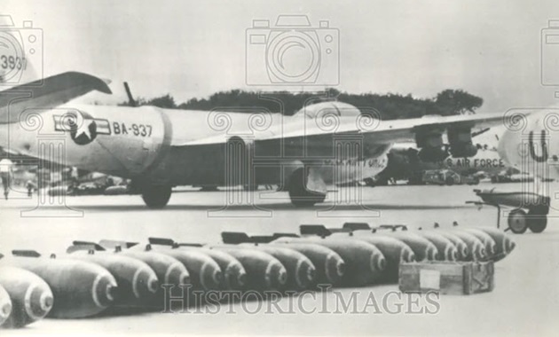 B-57B 53-3937 on the east ramp at Bien Hoa Air Base sometime before the accidental explosion. Note the line of bombs on the tarmac close to the armed bomber. B-57B 53-3937 was later destroyed in the explosion.