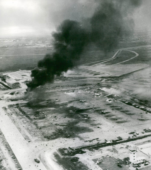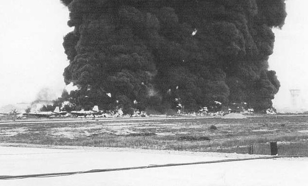 An aerial view after the exploding and burning B-57Bs. In the background, a JP-4 (a 50-50 kerosene-gasoline blend) jet fuel storage area is still burning. In the lower right corner of the photo is the control tower which was also damaged by flying debris.