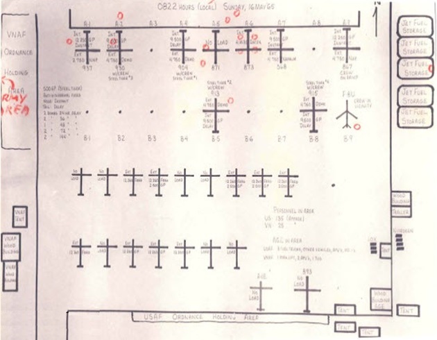 This diagram of the east ramp at Bien Hoa was created by the USAF Accident Review Board showing where all the aircraft were with their flight numbers and their weapons load listed. The red circles are the locations where bodies of those killed were found. The one plane symbol with swept wings is Major Bell’s F-8E Crusader and along the upper right edge of the diagram are the Jet fuel storage areas.