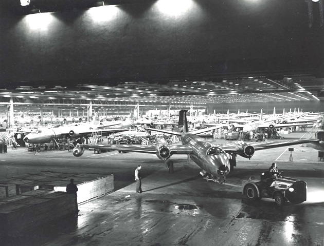 B-57As rolling off the Martin production line at Middle River in 1952. A row of B-57As is on the left and a row of RB-57As is on the right. The RB-57A was a Photo Reconnaissance production version with cameras installed in the bomb bay and only 67 were built.
