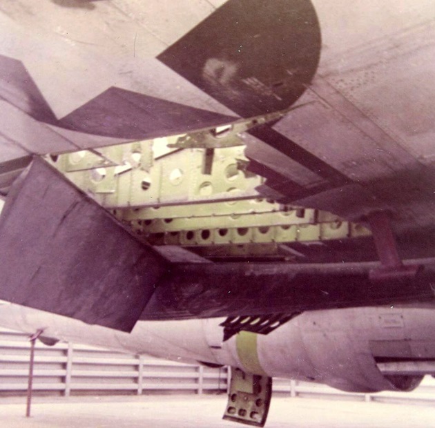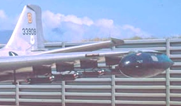 This is my close up of the port wing of B-57B 53-3908. Mounted on the four pylons appear to be SUU-30 cluster-bomb dispensers. The SUU-30 dispenser unit contained 665 tennis ball-sized fragmentation sub-munitions, also known as bomblets. Once dropped, the SUU-30 breaks open in-flight and releases the individual bomblets, scattering them over a large area.
