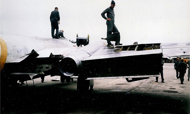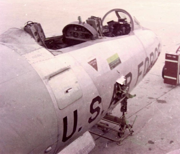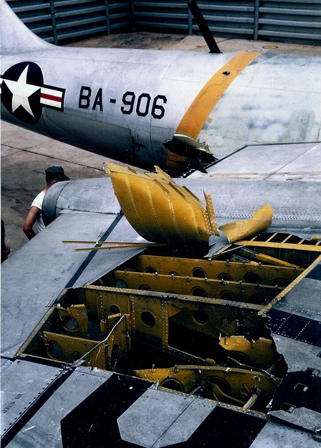 Wind, blasting through a large hole in the fuselage, scattered dirt and debris around the cockpit temporarily blinding Mason. As he regained his sight, he realized that a safe ejection could not be done because of Joyner’s wounded condition. With one engine shut down and the other on fire, and with approximately 30 squared feet (2.78 squared meters) of surface missing from the starboard wing, Mason attempted to return to base. Flight conditions were hampered by inoperative radios, no hydraulic pressure or oxygen, severe air frame vibration, and no indication of gear position or fuel level.