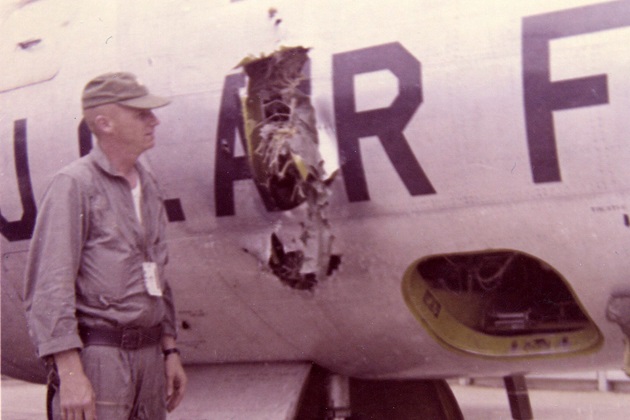 On 15 March 1966, while on a strafing run over Laos, Mason’s B-57B 53-3906 was hit repeatedly by enemy 37mm and 57mm shells which set fire to the starboard engine and created an extreme vibration in the port engine. One shell exploded in the rear cockpit, wounding navigator Joyner and severing a section of wiring which deprived the crew of most electrical power.