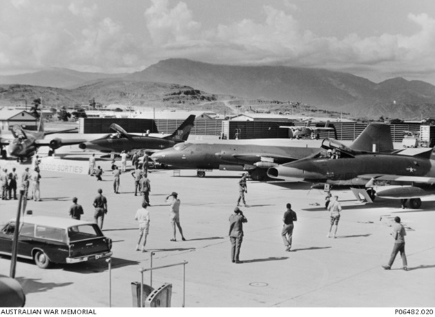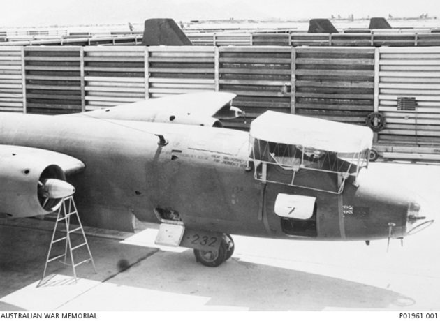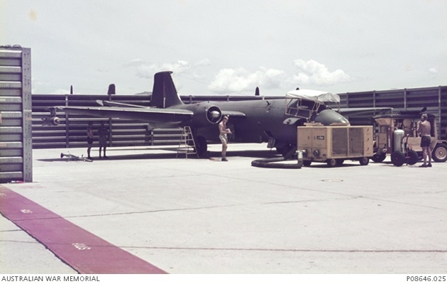 Canberra B.20s A84-231 and A84-233 on the ramp at Phan Rang Air Base. The Canberra in the foreground has a bomb mounted on its starboard wingtip pylon.