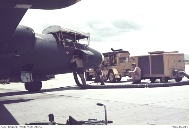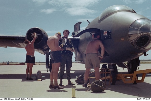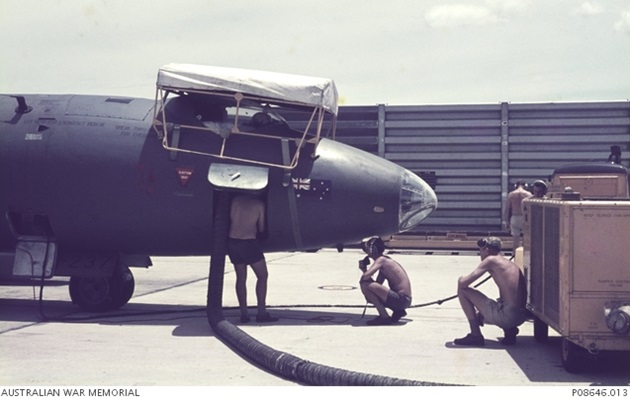 RAAF ground crew performing final checks on Canberra B.20 A84-237 at Phan Rang in November 1970.