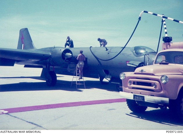 A Canberra B.20 bomber refueling in July 1970. The refueler truck is based on a 1956 International Harvester ASW 120 truck chassis.