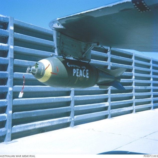 Message “Goodwill and PEACE” is painted on a bomb mounted on the Canberra B.20’s starboard wing tip pylon at Phan Rang in July 1970.
