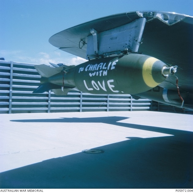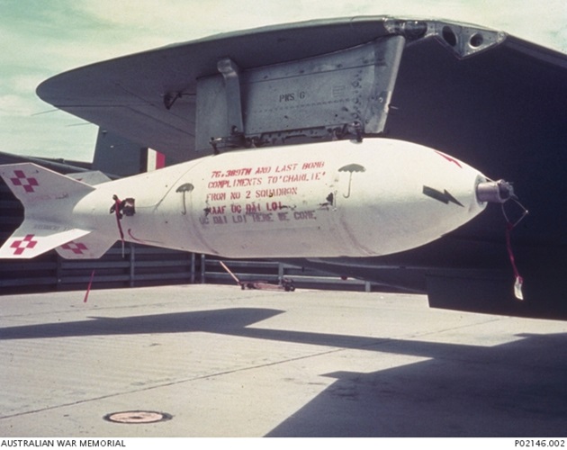 The last bomb dropped by the squadron in Vietnam was mounted on the right wing tip pylon of Canberra B.20 A84-244. The bomb was painted white and on the side the armourers had painted in red “76,389th and last bomb compliments to ‘Charlie’ from No. 2 Squadron RAAF UC Dai Loi” and below it in black is “UC Dai Loi HERE WE COME.” Two black umbrellas are on both sides of the message.
