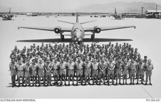 On 4 June 1971, the full complement of RAAF No.2 Squadron personnel at Phan Rang Air base posed for this photo, just before returning to Australia. In the background are a Canberra B.20 bomber (immediately behind the group) and two Fairchild C-123 Providers (background left and right). In the far background (behind the two C-123s and the Canberra) is a Fairchild C-119 Flying Boxcar.