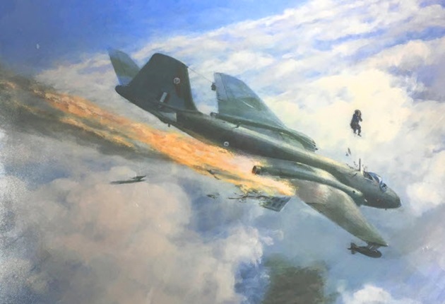 Arriving in the vicinity of the target under Skyspot direction, they were ordered to turn very steeply onto the target. About halfway through the turn, the Canberra was suddenly hit by a Surface-to-Air Missile (SAM). Then a second SAM flew past the burning jet, high to the right. Downing ordered Pinches to eject before he transmitted a “Mayday” distress call, then he ejected himself.