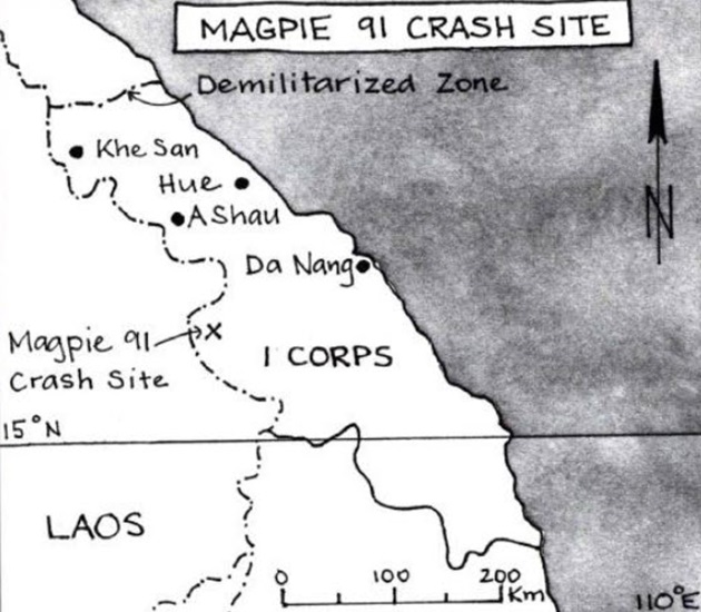 Magpie 91 made radio contact with the US radar officer who was directing them to a target in the Quang Nam Province. The target was believed to be a concentration of NVA regulars or a NVA headquarters. At 2022 hours in poor weather, they dropped six bombs on a target southwest of Da Nang and and just east of the Laotian border. After the bomb run, Magpie 91 turned about 80 degrees off its run-in heading and started to return to Phan Rang.