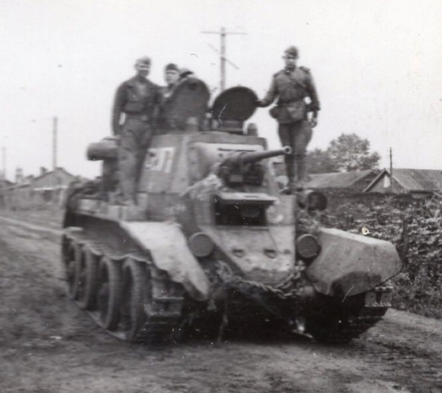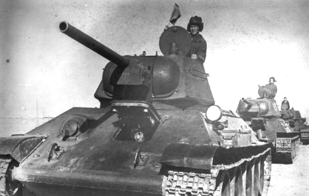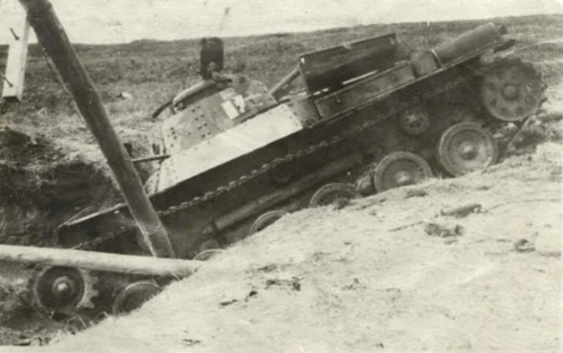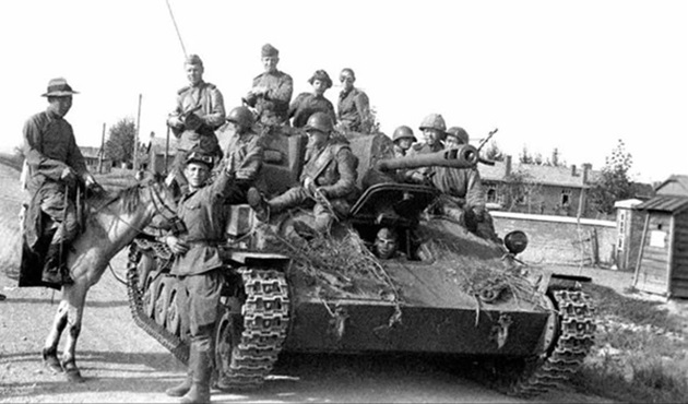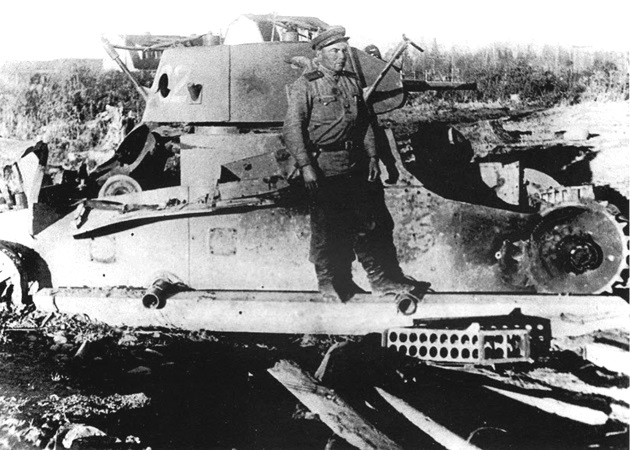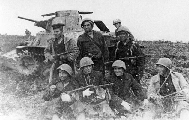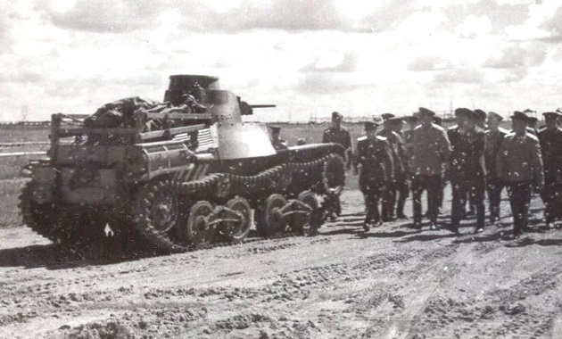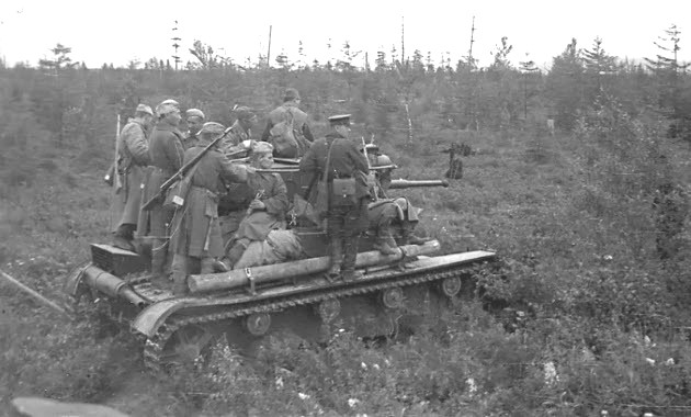 A Soviet T-26 tank carrying troop through a swampy area. Note the unditching log mounted on the tank’s right fender.