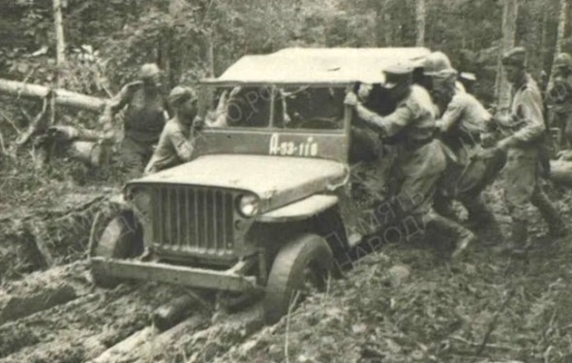 Soviet troops of the 1st Red Banner Army are pushing a US lend lease Jeep through the taiga after crossing the border.