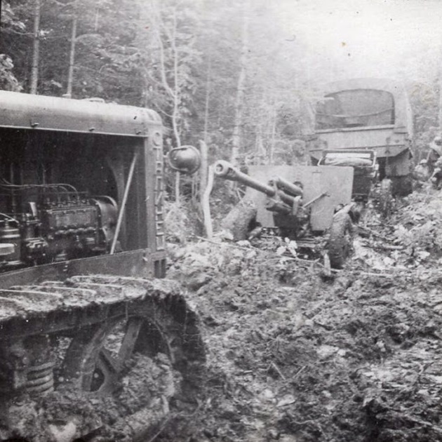 A US lend lease truck (probably a Studebaker US6) is towing a M1942 (ZIS-3) 76.2mm divisional field gun on a muddy road. In the foreground is a Stalinets-65 diesel engine tractor.