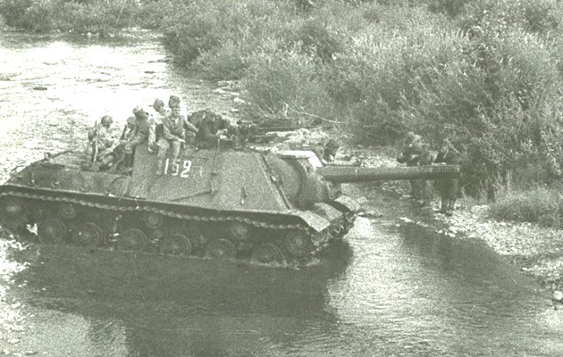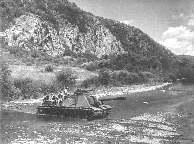 Soviet ISU-152 SPG number 155 fording the Muling River (a left tributary of the Ussuri) east of Mudanjiang in Manchuria (today China). Cities of Jixi and Hulin are located on the Muling River.